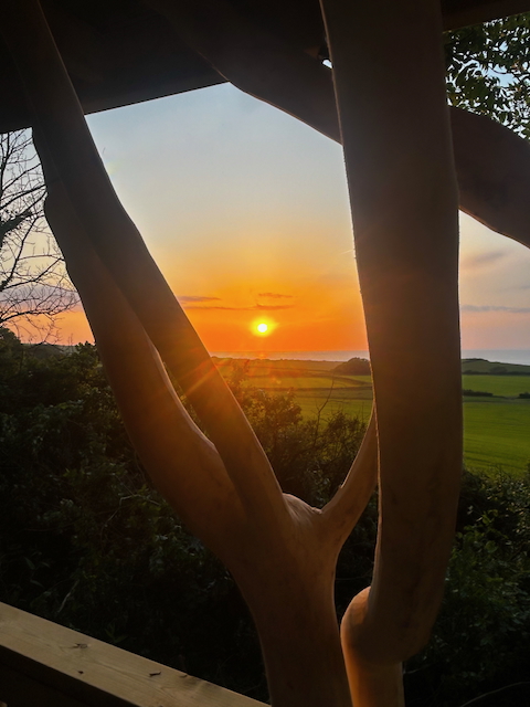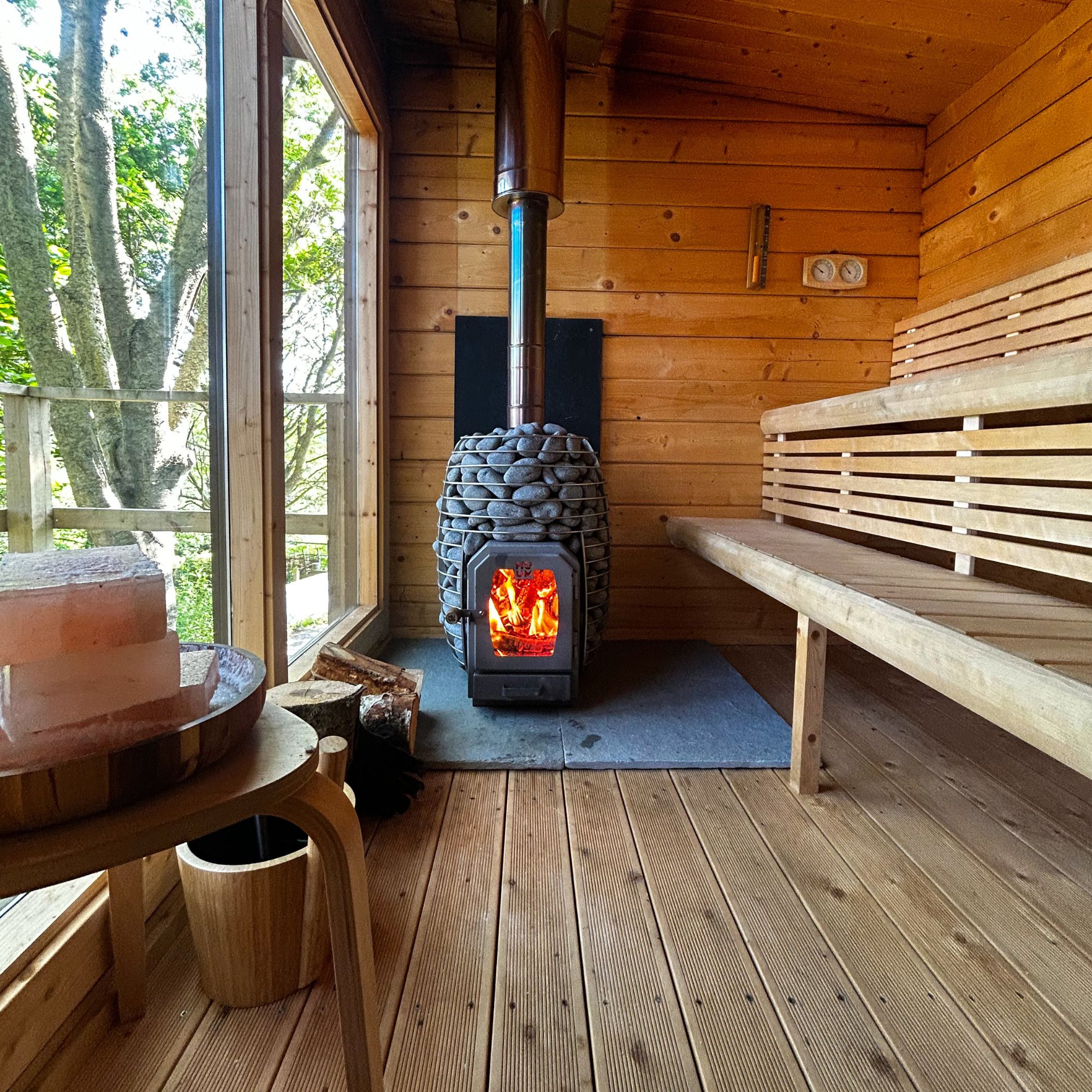 Our outdoor woodland spa features a sauna with stunning views through the trees and out to the sea, a large wood-fired hot tub that seats up to eight people, an ice bath, and an outdoor shower under the forest canopy. There’s even a drench bucket for a refreshing boost.